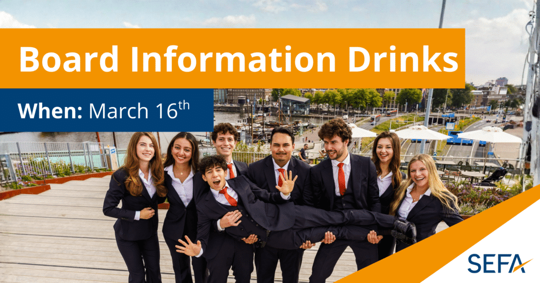 Join our Information Session on the 16th of March! Come by for a drink at Krater, meet the current board, and ask any questions you may have. Whether you’re already active within Sefa, a former member, or completely new to the association, you are more than welcome.